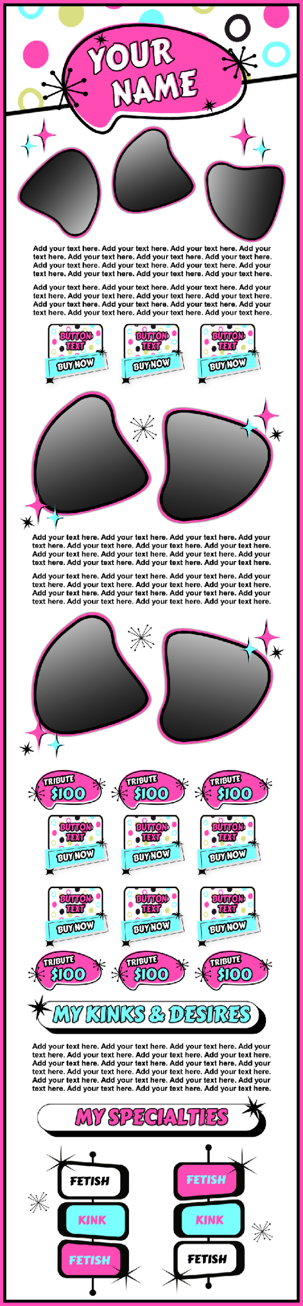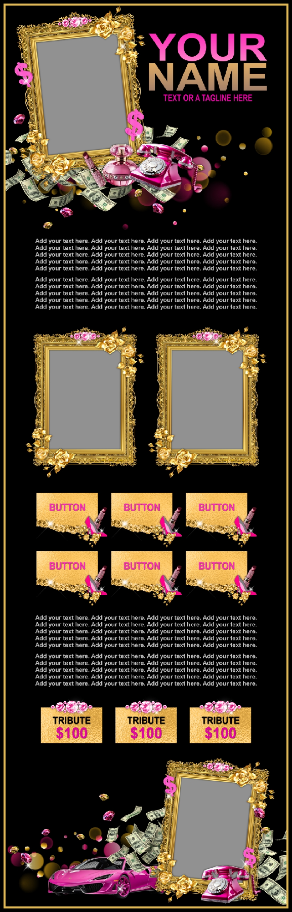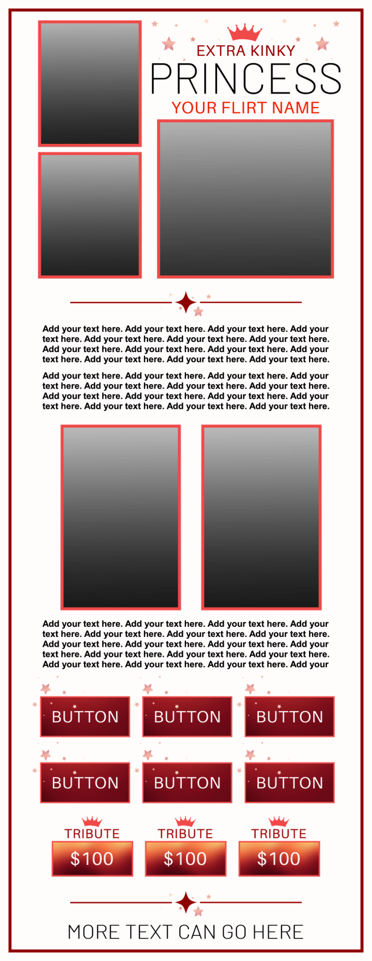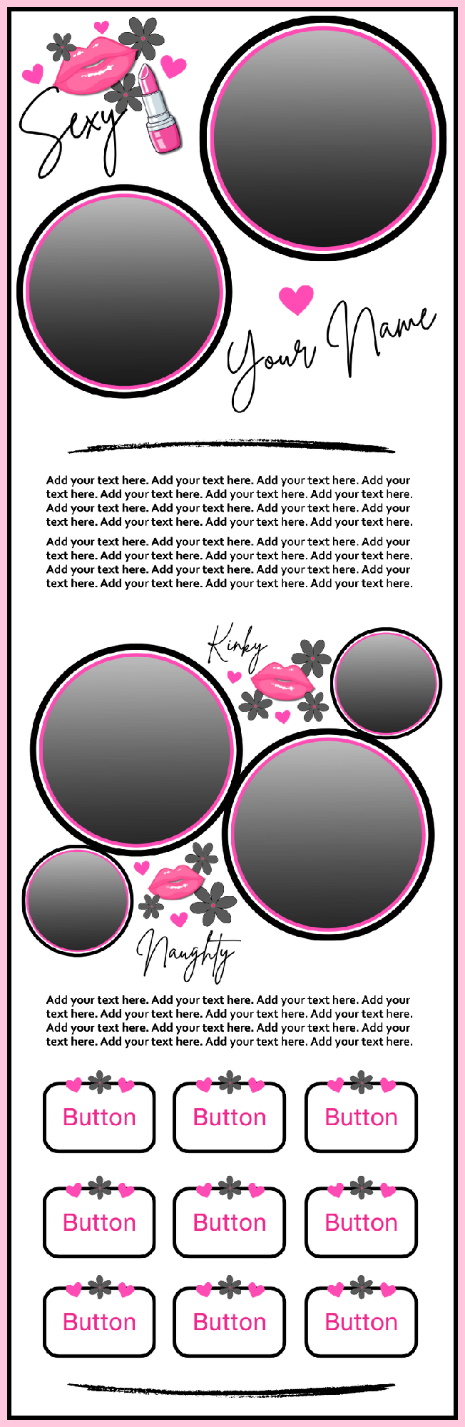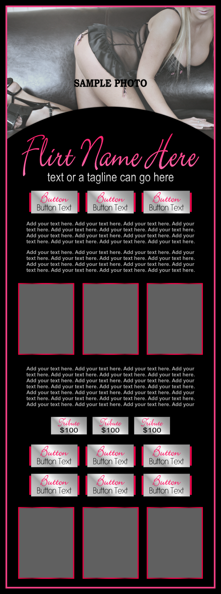 Pre-Made Niteflirt Templates Photos displayed on the template preview are sample images only. They will be replaced with your photos. Additional buttons and/or photos are $2.00 each if requested at the time of purchase. Animated Buttons will be more. SOLD*Black and Bright - $35EXTRA KINKY PRINCESS - $35Submissive Girl - $47Retro Style - $47Brighten Up - $32Mistress Bold - $42Half n Half - $38Girl Next Door - $45Greedy Princess - $48Spoiled Brat - $45Naughty GF - $32T25 - Golden - $25T25 Gold Lips - $25Pinky Peachy - $38Hint of Pink - $42Sexy Lips and Hearts $38Silver Blue - $38Starry Black $38Simple Kiss - $38T25 Blue - $25Layer It 2 - $35Diamond Rows - $45T25 wcDark - $25Painted Daisy - $40celestial sky Red - $38Wild - $42T25 Dots - $25Pink and Gray - $42Celestial Sky Blue - $38Just Simple 1 - $38HOTWIFE $30T25 Boho - $25Silver Pink - $38Mistress Red - $45Pink Glitz $35Peach n Blue $35Heart Swirls - $35Painted Flowers - $40Layer It 1 - $35Grunge Heart 2 - $30Grunge Heart $30just simple 2 - $35Checked - $42Hearts n Stars - $30confessions - $38HOMEWRECKER - $35Midnight purple - $42Pay and Obey - $45Autumn Flowers - $42Sparkle Allure $38Spotlight - $45pm1 - $38SS-Peach Pink - $48Slightly Vintage - $38Silver and Golden $30Glittery Pink - $43PM12 - $38Purple Haze $43Tropical Fire - $38Sweet Pinks $38Purple Bokeh - $38Pretty Blues - $33PM2 $32Daisy Blue $32Hippie Style $35Simply Cherry $30Certified Bad Girl $35PM-Summer Kisses $33PM - Princess Castle $28PM Sensual Mistress $45PM Mistress Pink $38PM5 $35PM Expensive $35PM4 $28Chalkboard Princess $38pm6 $38Your Goddess $35PM Black and Pink $35Graffiti 2 $48Classy Bitch $38Splashed 1 $43PM Lips on Black $35PM15- 1 $35Splashed 2 $43PM Blue Bliss $35Desert Sunset $35Scrappy Style Flower $45sln purple $30PM Blue Abstract Kiss $35sln kiss - $32PM XXX Princess $38sln mint $30sln stars $30Bubblegum Babe $38sln cotton candy $30White Night $32Softly Pink - $32STAR CLUSTER $32PM Strawberry $43Just blue and white $35All in pink - $40sln flower - $35Arched - $35PM Whimsy $40PM Pinned _$38PM Sissy Journey $45PM-Sweet Girl - Orchid - $35PM-Sexy Cougar $25PM11 $42minty peach - $32SL - Bright Blue _$42PM Naughty little Slut $35 / SALE $2590s Vibe -$50vintage textured $38Scrappy Hawaiian $32Lazy Blues - $32Golden Princess $38Green Goddess $38Classy Bitch $38Haze - $35Sl - Pink Blue - $38Pink Gold Grunge -$42Silver Red Gold - $48Summer Splash - $38G22 - Purple - $35G22 - Pink -$35TOP ROW - $4518L-Pink - $40Cherry Time $48Lock and Key - $43PM BP $35PM8 $40PM5 $38Desert Sunset $38STAR CLUSTER $35Pink Curves -$35Red Gold Burst $35Sexy Sparkles- $35Rich Girl $40