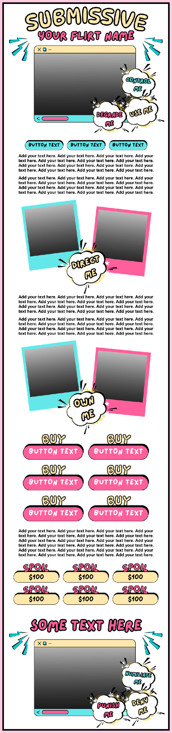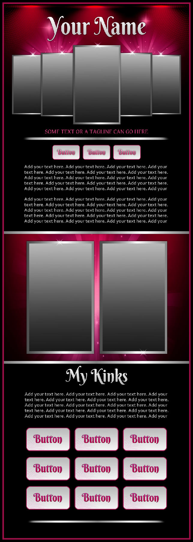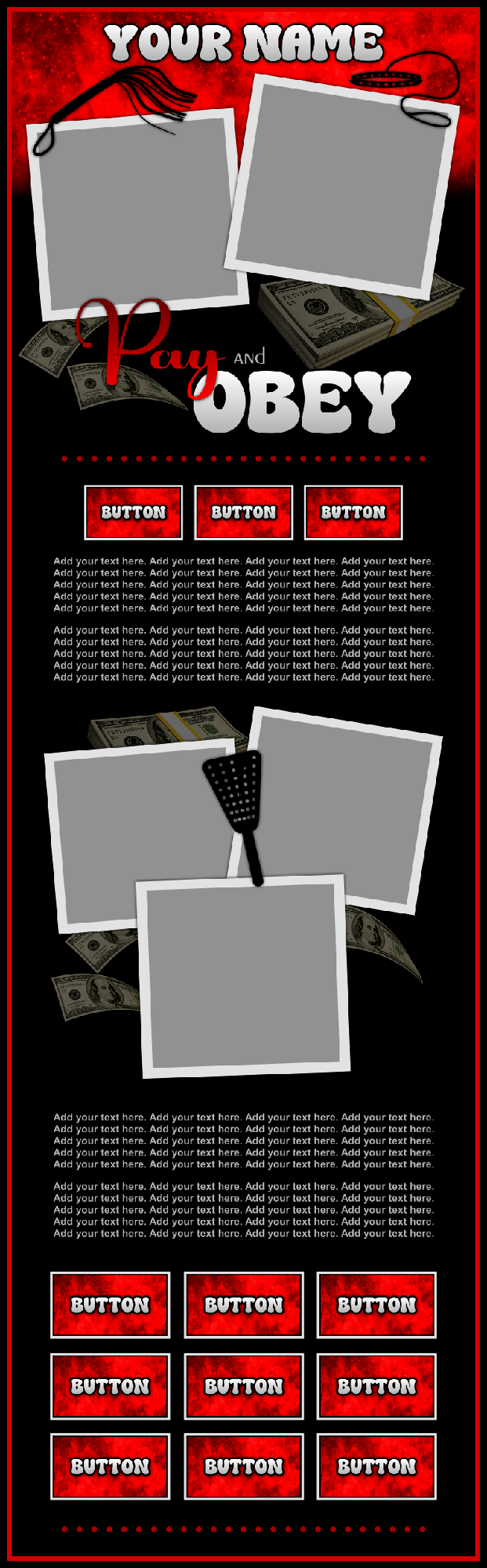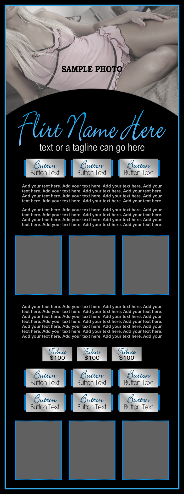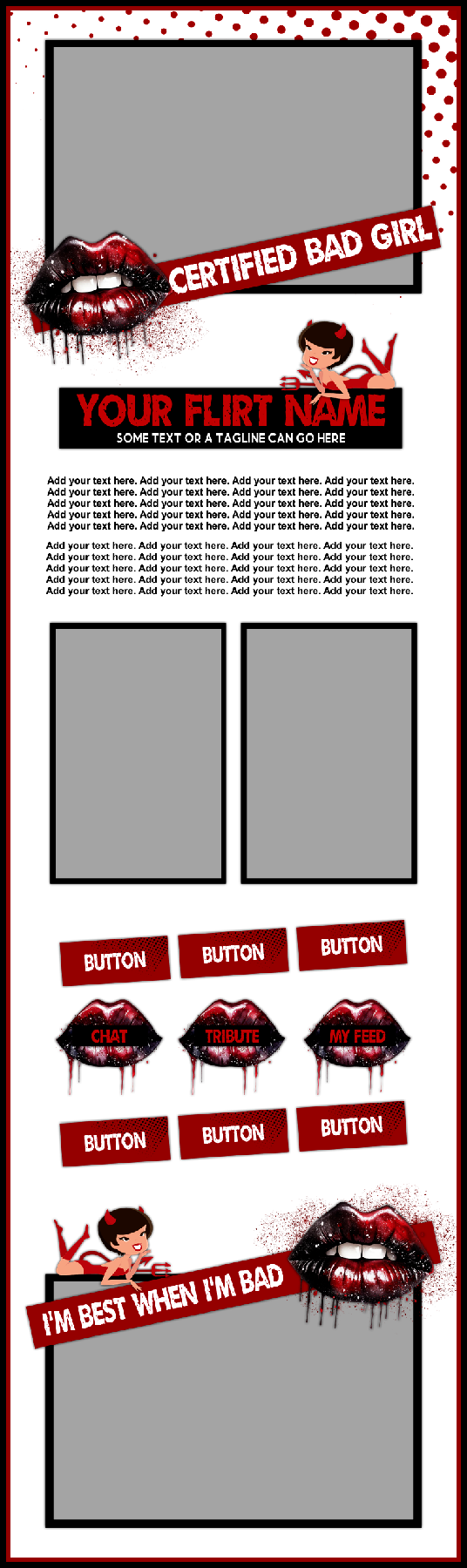 Pre-Made Niteflirt Templates Photos displayed on the template preview are sample images only. They will be replaced with your photos. Additional buttons and/or photos are $2.00 each if requested at the time of purchase. Animated Buttons will be more. SOLD*Black and Bright - $35EXTRA KINKY PRINCESS - $35Submissive Girl - $47Retro Style - $47Brighten Up - $32Mistress Bold - $42Half n Half - $38Girl Next Door - $45Greedy Princess - $48Spoiled Brat - $45Naughty GF - $32T25 - Golden - $25T25 Gold Lips - $25Pinky Peachy - $38Hint of Pink - $42Sexy Lips and Hearts $38Silver Blue - $38Starry Black $38Simple Kiss - $38T25 Blue - $25Layer It 2 - $35Diamond Rows - $45T25 wcDark - $25Painted Daisy - $40celestial sky Red - $38Wild - $42T25 Dots - $25Pink and Gray - $42Celestial Sky Blue - $38Just Simple 1 - $38HOTWIFE $30T25 Boho - $25Silver Pink - $38Mistress Red - $45Pink Glitz $35Peach n Blue $35Heart Swirls - $35Painted Flowers - $40Layer It 1 - $35Grunge Heart 2 - $30Grunge Heart $30just simple 2 - $35Checked - $42Hearts n Stars - $30confessions - $38HOMEWRECKER - $35Midnight purple - $42Pay and Obey - $45Autumn Flowers - $42Sparkle Allure $38Spotlight - $45pm1 - $38SS-Peach Pink - $48Slightly Vintage - $38Silver and Golden $30Glittery Pink - $43PM12 - $38Purple Haze $43Tropical Fire - $38Sweet Pinks $38Purple Bokeh - $38Pretty Blues - $33PM2 $32Daisy Blue $32Hippie Style $35Simply Cherry $30Certified Bad Girl $35PM-Summer Kisses $33PM - Princess Castle $28PM Sensual Mistress $45PM Mistress Pink $38PM5 $35PM Expensive $35PM4 $28Chalkboard Princess $38pm6 $38Your Goddess $35PM Black and Pink $35Graffiti 2 $48Classy Bitch $38Splashed 1 $43PM Lips on Black $35PM15- 1 $35Splashed 2 $43PM Blue Bliss $35Desert Sunset $35Scrappy Style Flower $45sln purple $30PM Blue Abstract Kiss $35sln kiss - $32PM XXX Princess $38sln mint $30sln stars $30Bubblegum Babe $38sln cotton candy $30White Night $32Softly Pink - $32STAR CLUSTER $32PM Strawberry $43Just blue and white $35All in pink - $40sln flower - $35Arched - $35PM Whimsy $40PM Pinned _$38PM Sissy Journey $45PM-Sweet Girl - Orchid - $35PM-Sexy Cougar $25PM11 $42minty peach - $32SL - Bright Blue _$42PM Naughty little Slut $35 / SALE $2590s Vibe -$50vintage textured $38Scrappy Hawaiian $32Lazy Blues - $32Golden Princess $38Green Goddess $38Classy Bitch $38Haze - $35Sl - Pink Blue - $38Pink Gold Grunge -$42Silver Red Gold - $48Summer Splash - $38G22 - Purple - $35G22 - Pink -$35TOP ROW - $4518L-Pink - $40Cherry Time $48Lock and Key - $43PM BP $35PM8 $40PM5 $38Desert Sunset $38STAR CLUSTER $35Pink Curves -$35Red Gold Burst $35Sexy Sparkles- $35Rich Girl $40